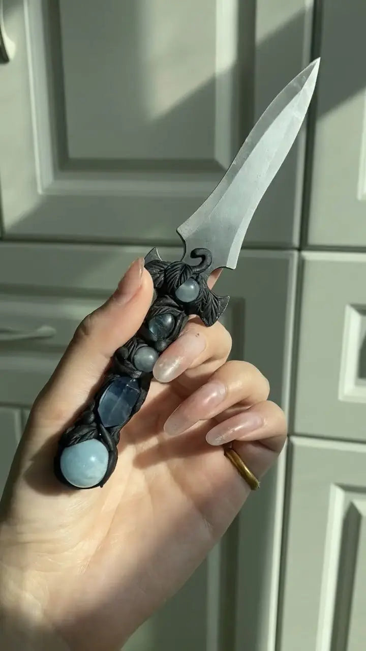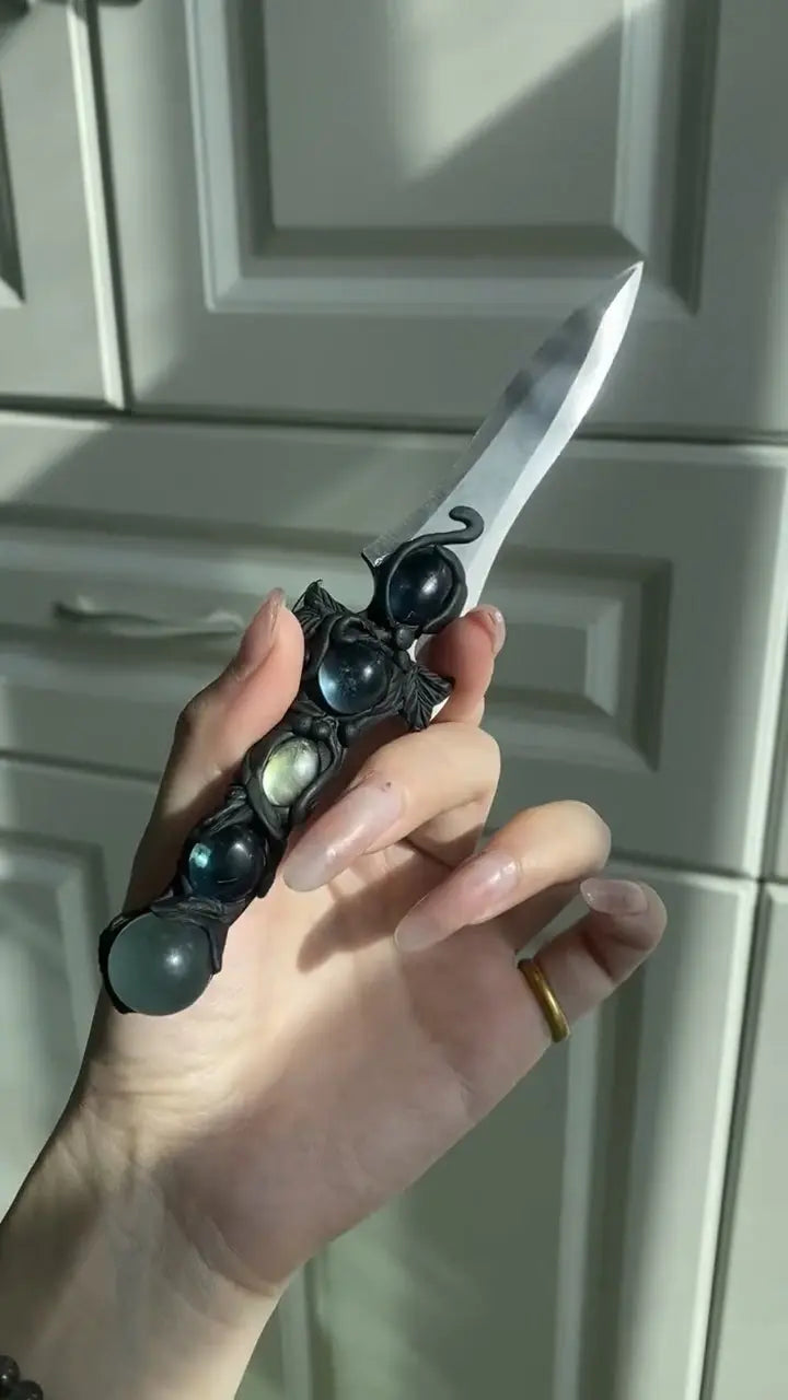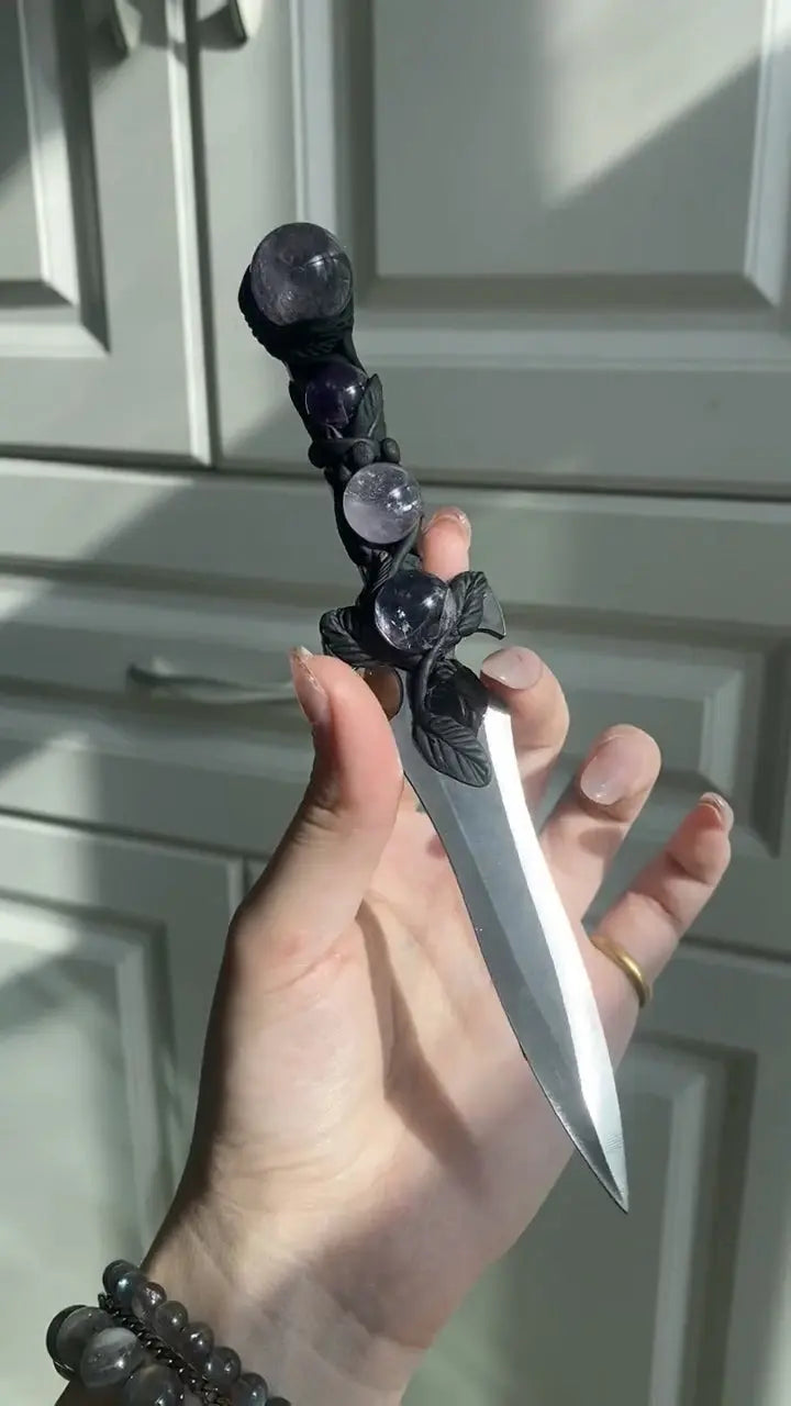 The Aura Blade Collection is crafted as ritual daggers for your spiritual journey, inspired by natural energy and ancient magic. Each piece merges the high-frequency vibration of crystals with hand-sculpted vine textures, serving as an energy anchor to connect with your inner divinity and elevate your ritual practice. 🔮 Product Details 1. Moonlight Shadow Dagger (Moonstone) Product Name: Moonlight Shadow Dagger · Intuition Awakening Ritual Blade Design Inspiration: Inspired by forest vines under a full moon, the winding texture mimics moonlight filtering through leaves. The adularescence of moonstone flows like liquid moonlight, designed to awaken inner intuition and balance emotional frequencies. Materials: 304 stainless steel blade (mirror polished), eco-resin handle with hand-sculpted vine texture, inlaid with natural moonstone and obsidian. Dimensions: Total length ~18cm, blade length ~7cm, handle diameter ~2.5cm. 2. Forest Wraith Dagger (Smoky Quartz) Product Name: Forest Wraith Dagger · Grounding Protection Ritual Blade Design Inspiration: Rooted in the ancient underground roots of old-growth forests, deep brown smoky quartz acts as a core of earth energy accumulated over millennia. The vine texture symbolizes the resilience of life, creating a stable grounding shield to dispel low-frequency energy. Materials: 304 stainless steel blade (matte brushed), eco-resin handle with hand-sculpted vine texture, inlaid with natural smoky quartz and pyrite. Dimensions: Total length ~17.5cm, blade length ~6.8cm, handle diameter ~2.4cm. 3. Stardust Spirit Dagger (Clear Quartz) Product Name: Stardust Spirit Dagger · High-Frequency Purification Ritual Blade Design Inspiration: Derived from the flow of cosmic stardust, transparent clear quartz embodies concentrated starlight, while the vine texture mimics the winding of star trails. Ideal for space purification and raising energy frequencies, it is a high-vibration companion for meditation and rituals. Materials: 304 stainless steel blade (mirror polished), eco-resin handle with hand-sculpted vine texture, inlaid with natural clear quartz and amethyst. Dimensions: Total length ~18.2cm, blade length ~7.2cm, handle diameter ~2.6cm. 🕯️ Usage Scenarios Spiritual Rituals: Use as an energy conduit for opening, cleansing, and protection ceremonies Space Purification: Place on altars or energy centers to stabilize space frequencies Meditation Aid: Hold the dagger to connect with crystal energy and deepen meditative states 📌 Important Note This product is a spiritual ritual tool, not a practical knife. Do not use for cutting or striking hard objects. Crystals are natural minerals, so slight variations in texture and color are normal and unique to each piece.