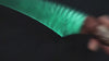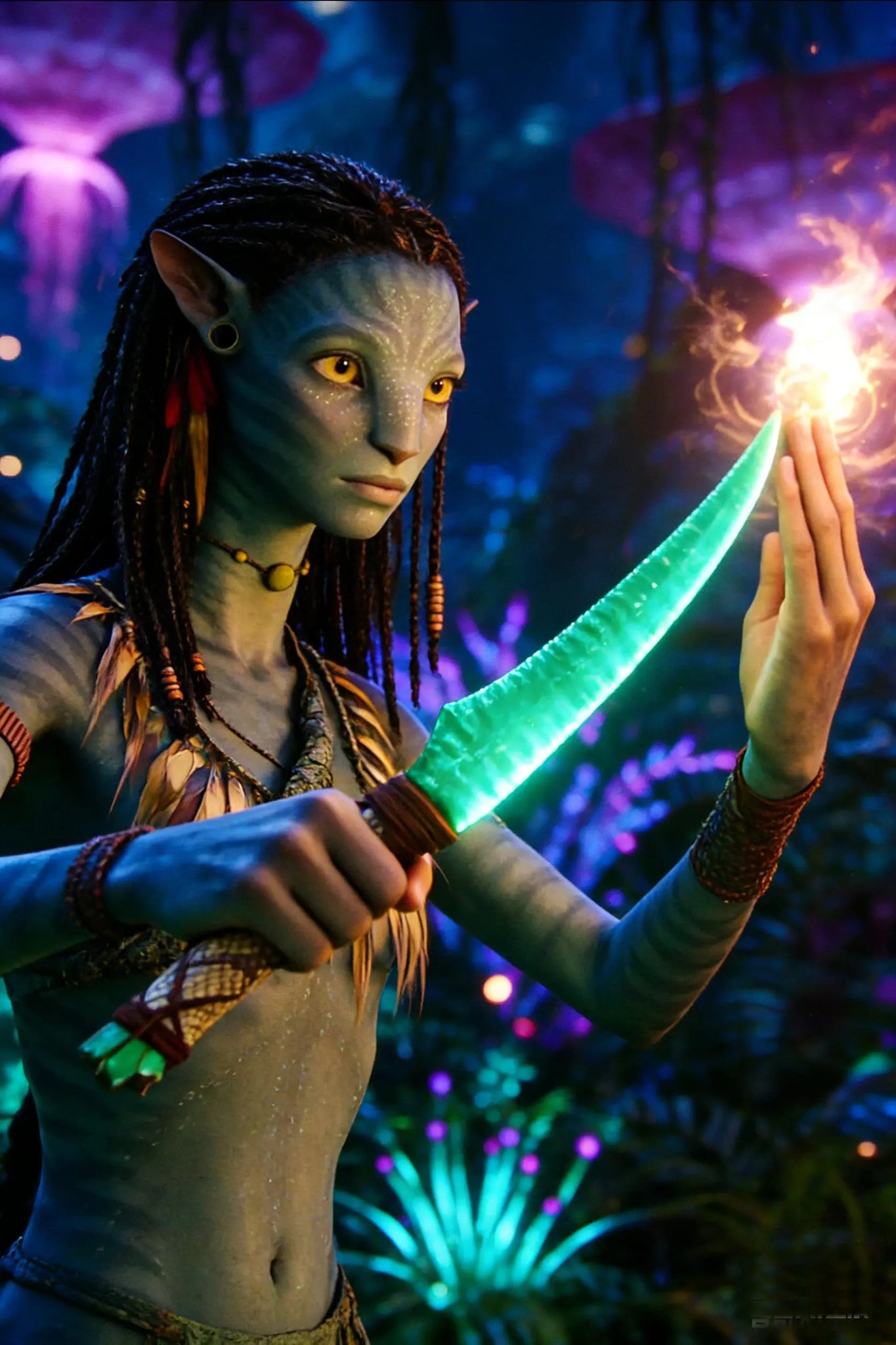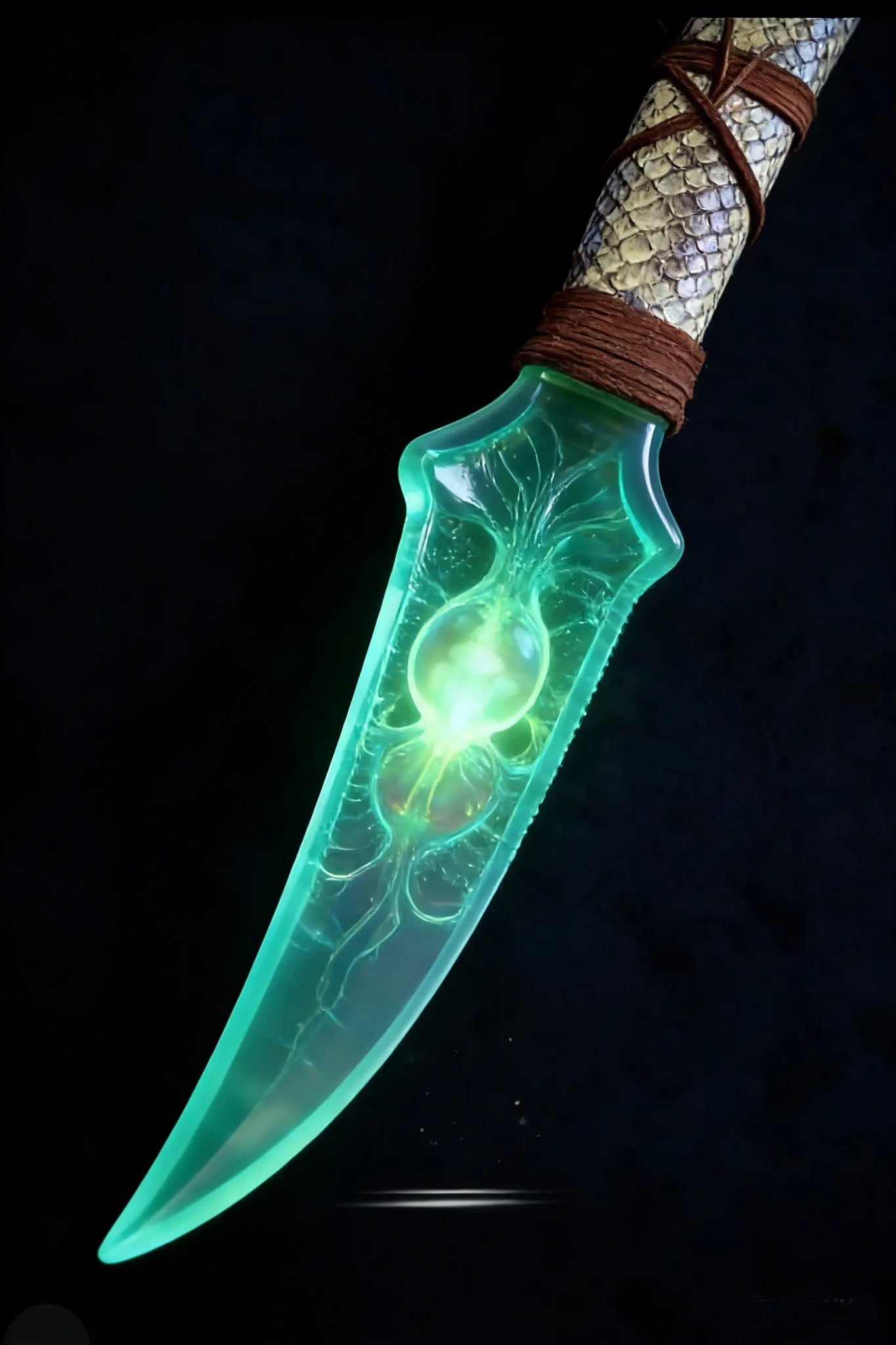 Inspired by the sacred covenant rituals of the Na'vi people on Pandora—this dagger is the core token for Na'vi warriors to connect with the spiritual entity (Eywa). It carries the ancient belief of "interconnection of all things". The blade is made of natural green cat's eye stone, replicating the Na'vi's worship of "the light of life". The flowing faint glow of the cat's eye stone is like the bioluminescent plants of Pandora at night, hiding the energy pulse of Eywa. The handle is wrapped with simulated Na'vi vine textures, paired with a base imitating animal bone texture, restoring the hand-polished primitive texture of the Na'vi people. Every detail echoes their philosophy of coexisting in harmony with the planet's creatures, serving as both an energy anchor in rituals and a tangible expression of Pandora's spirit.